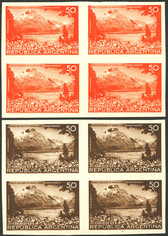 50c. UPU Congress, proofs in chestnut and orange, in blocks of 4, VF (Image)