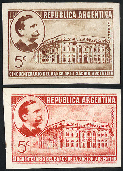 1941 Banco de la Nación Argentina, PROOFS in yellow-chestnut and vermilion, imperforate, on paper of glazed front, VF quality, rare! (Image)
