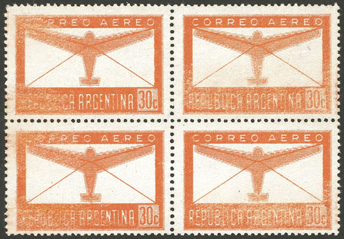 airmail, 30c., chalky paper, block of 4 with very dirty impression, "CORREO" and "REPUBLICA" almost illegible in 2 stamps, VF (Image)