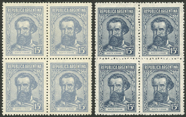 GJ.883,15c. Güemes, with dim and clear straight rays wmk, in blocks of 4, VF (Image)