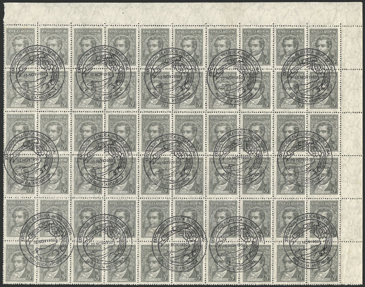 Moreno, straight rays wmk, large corner block of 60 with postmark of an International Philatelic Exhibition, VF! (Image)