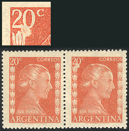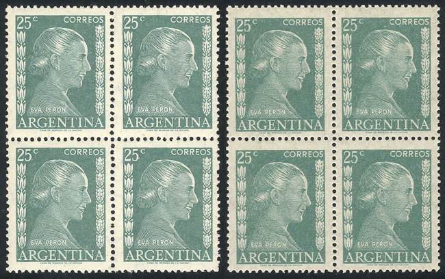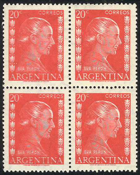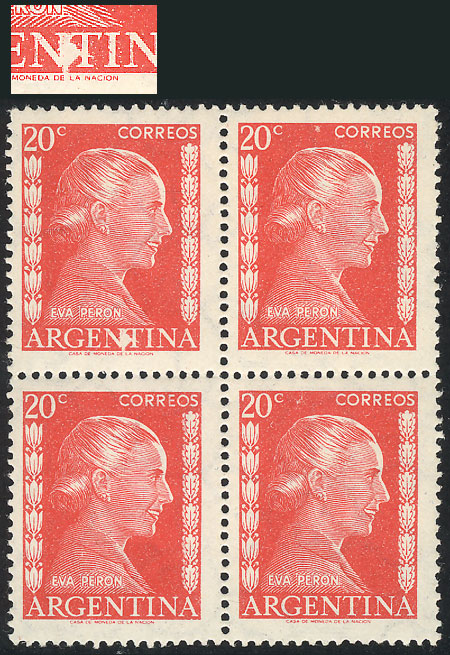GJ.1006a, 20c. Eva Perón printed on imported unsurfaced paper, block of 4, the left stamps with DOUBLE IMPRESSION variety, excellent quality! (Image)
