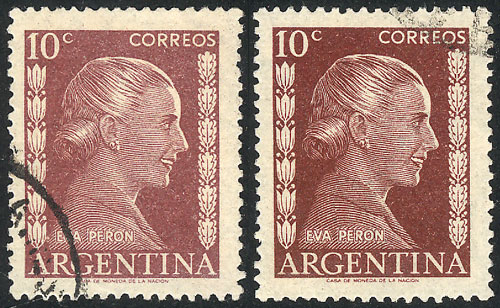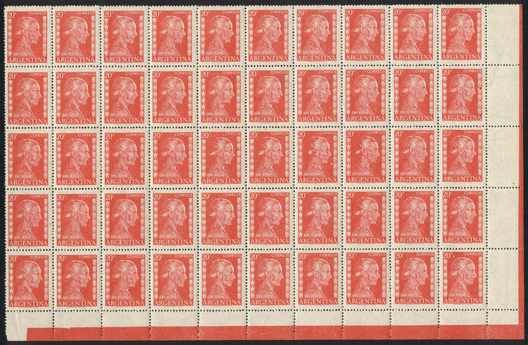20c. Eva Perón, on national paper, large block of 50 stamps (positions 51 to 100, right half of the sheet), with a number of VARIETIES (1958 Kneitschel, volume I, page 435), for example pos. 75 to 78 with incomplete face, VF! (Image)