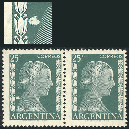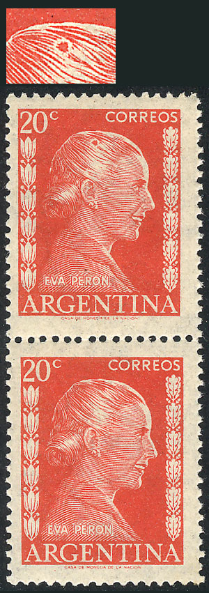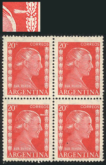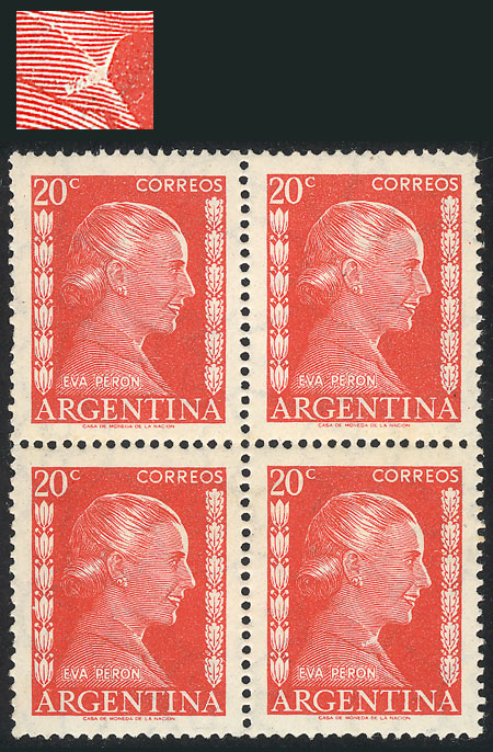GJ.1006A, 20c. Eva Perón, national unsurfaced paper, block of 4, with varieties: one with "White spot below the C of CORREOS", and one with "White spot below the O of CORREOS", sheet margin, unused, without gum, crease (Image)