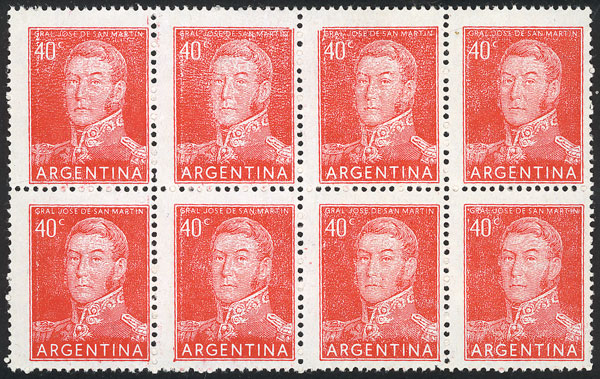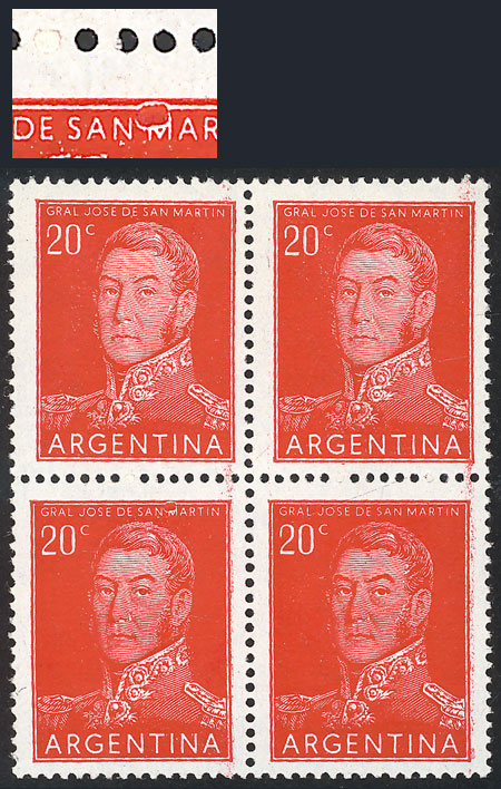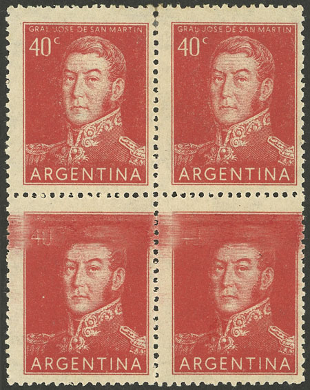 40c. San Martín, offset, block of 4, the bottom stamps with variety: Top part "erased", VF quality (Image)