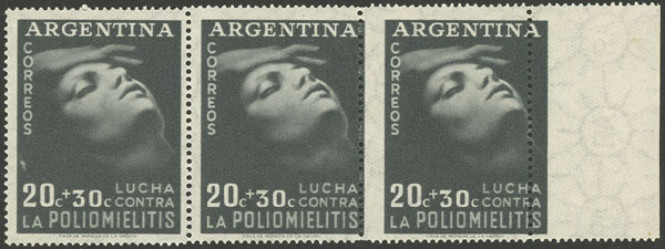 30+30c. Polio, strip of 3 stamps, with perforation variety that notably affects the perforation of the right and central stamps, VF (Image)