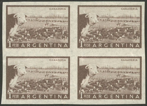 1P. Cattle, imperforate block of 4, with light crease (Image)