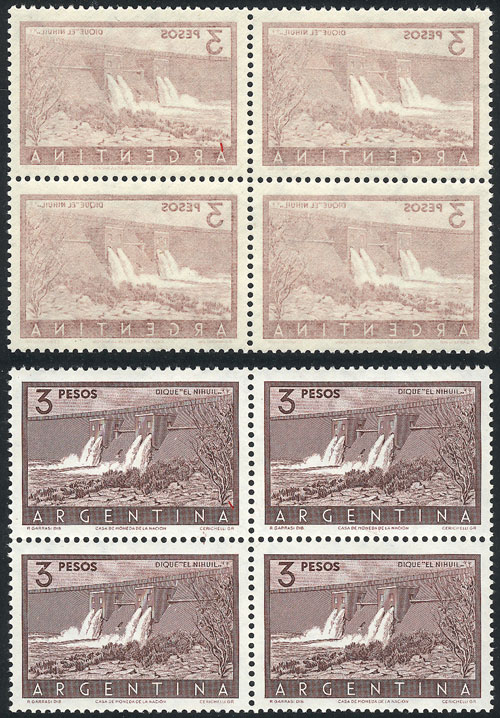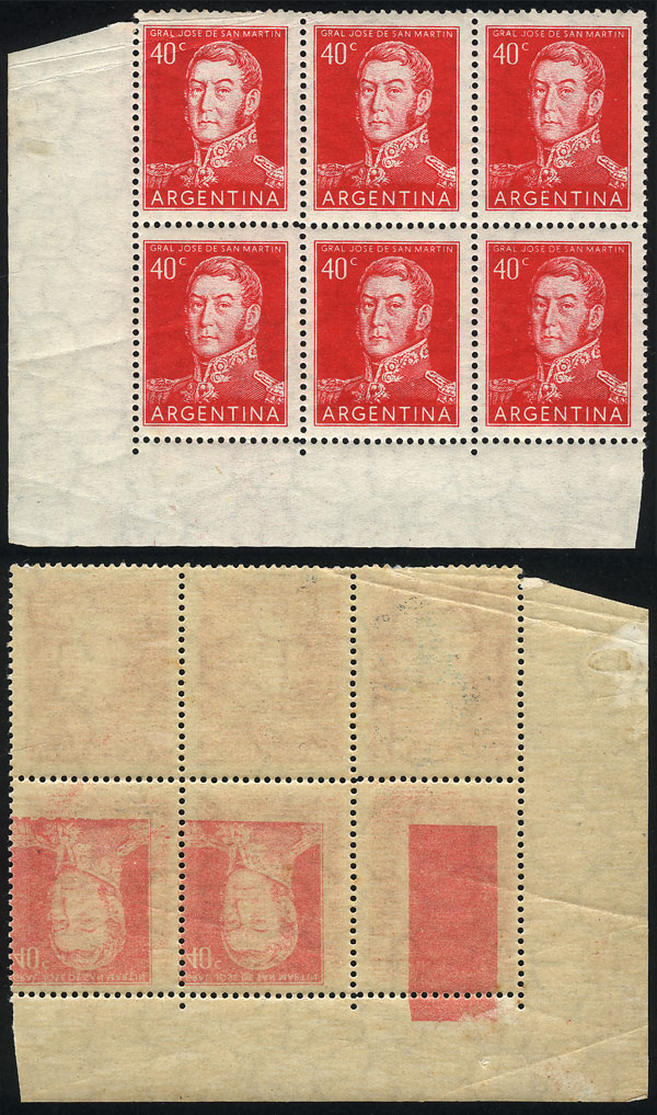 corner block of 6, with VARIETY: negative impression on back, inverted, excellent and rare! (Image)