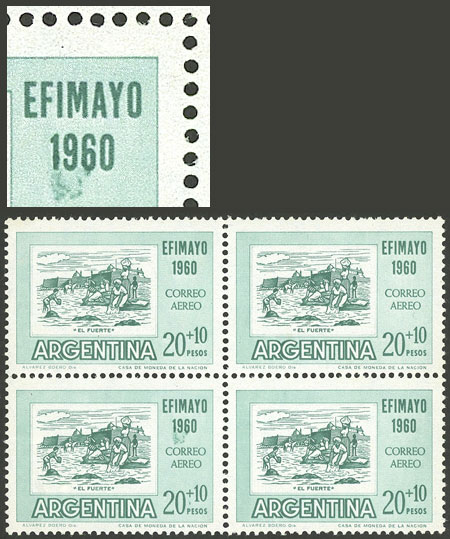 airmail 20+10P. Inter-American philatelic expo, May Revolution 150 years, EMIFAYO 1960, block of 4, one with variety: Spot below "1960", VF (Image)