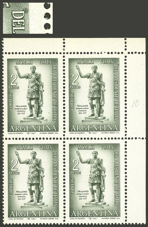 2P. Visit of the president of Italy, corner block of 4, one with variety: Spot beside "D" of DEL, VF quality (Image)
