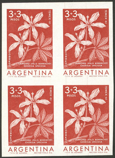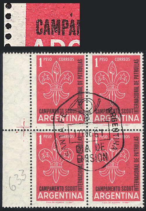 block of 4 with first day postmark, one with VARIETY: second "A" of CAMPAMENTO with accent, VF (Image)