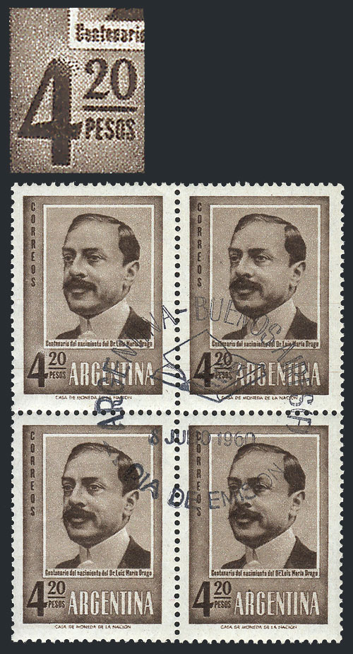 Centenary of the birth of Dr. Drago, block of 4 with first day postmark, one stamp with retouch in "4", VF! (Image)
