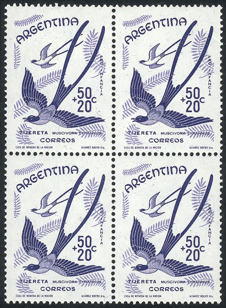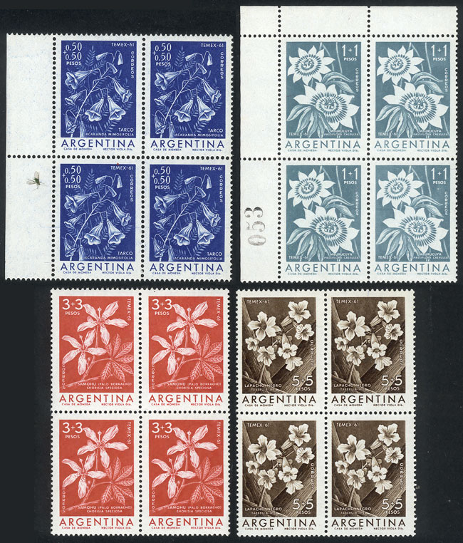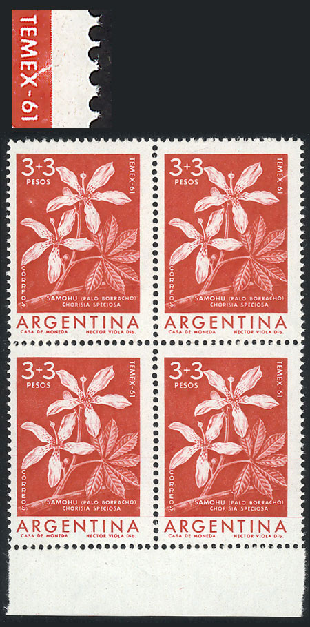 block of 4, one with VARIETY: long second stroke of the "X" of TEMEX, VF (Image)