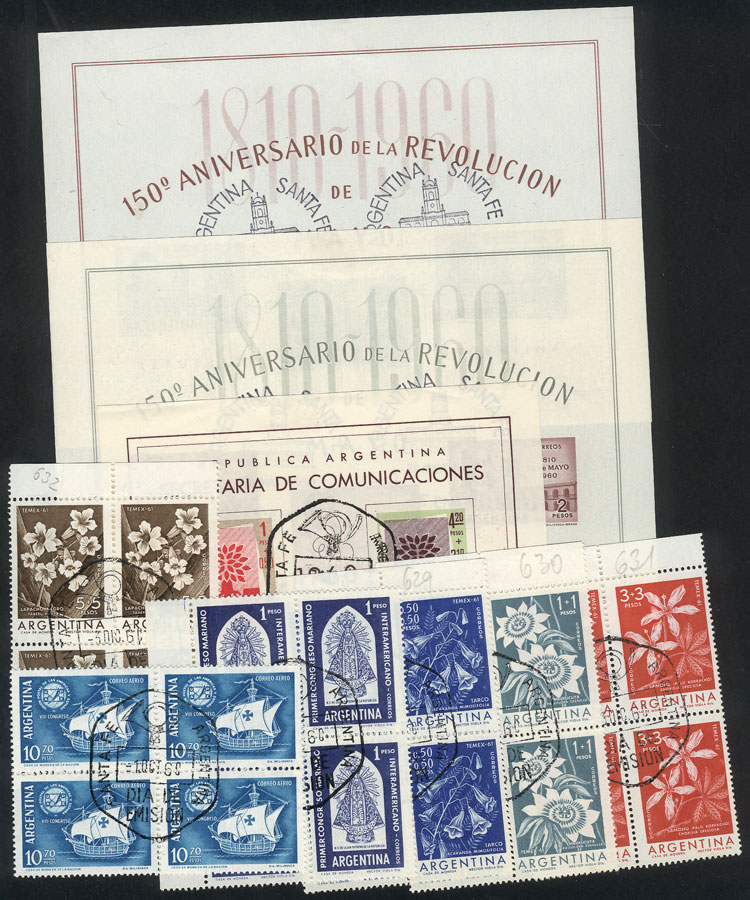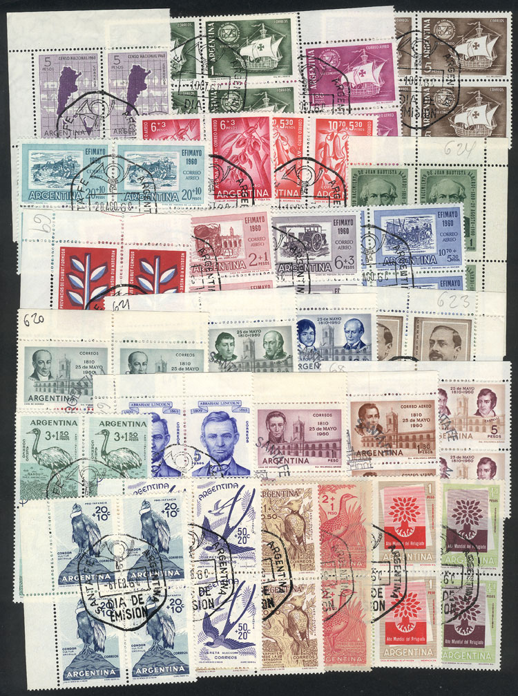 GJ.1159 + other values, commemorative stamps issued in 1960 (without GJ.1195/98), including GJ.HB 16/18, in blocks of 4 with first day postmarks