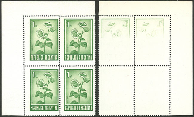 GJ.1539A, 1c. Sunflower, horizontal Casa de Moneda wmk, corner block of 4, 2 with variety: Partial offset impression on back. Also the left stamps are VERY WIDE due to shifted perforation!, VF (Image)