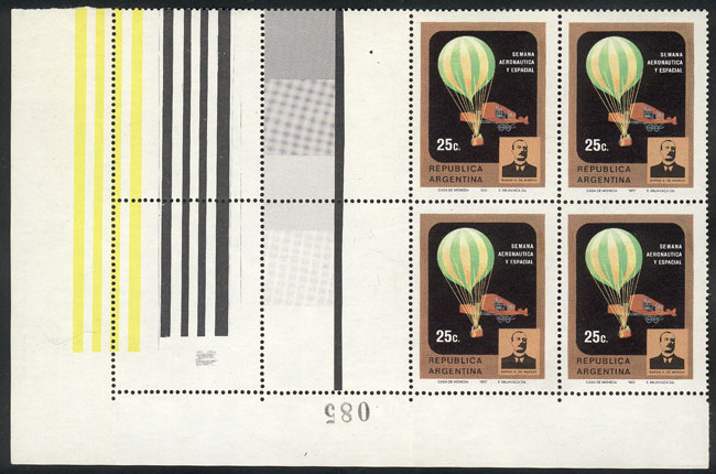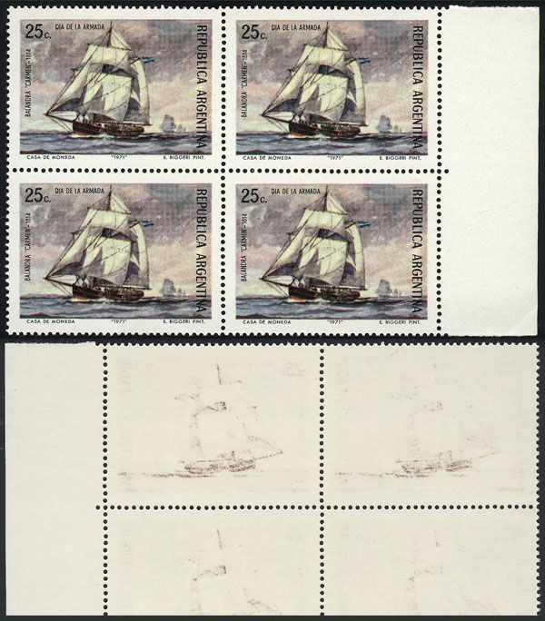 25c. Navy Day, marginal block of 4, with offset impression of the ship on back, VF quality (Image)