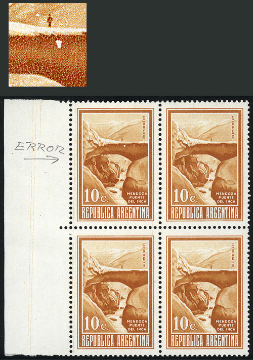 10c. Incan Bridge, block of 4, one with 'white spot over the bridge' variety, VF quality (Image)