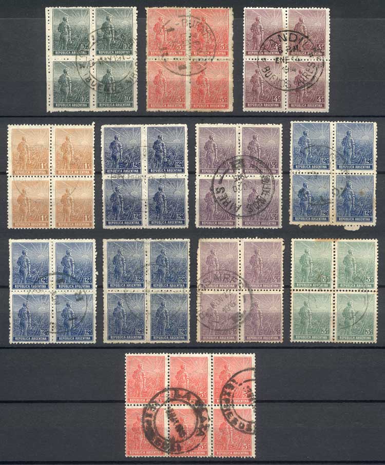 1070   imageLot of 12 blocks of 4 of the Plowman issue, all used, many with interesting cancellations, excellent quality! (Image)