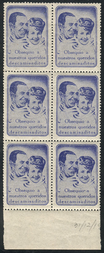 1073   image"Gift for our dear Descamisados", Juan Perón and Eva, marginal block of 6, VF quality (Image)