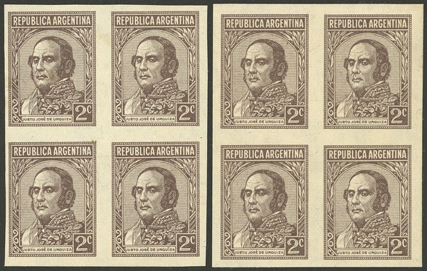 1935 2c. Urquiza, 2 TRIAL COLOR PROOFS in blocks of 4, different chestnut shades, excellent quality! (Image)