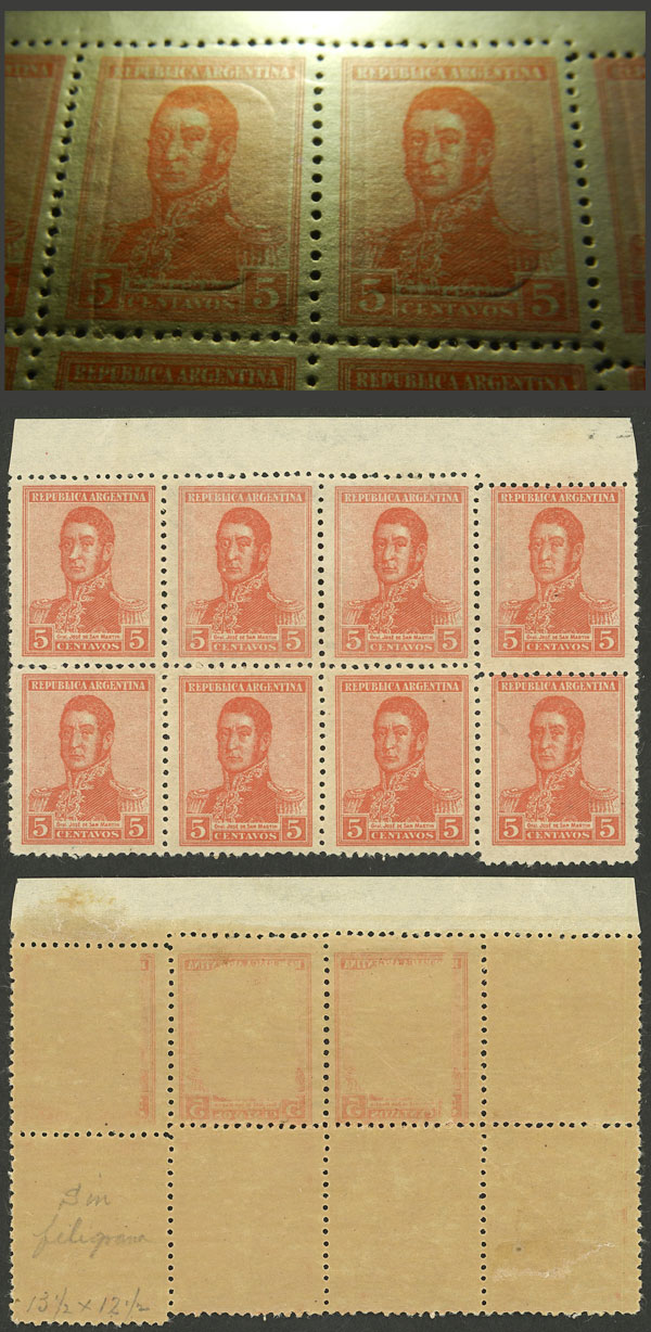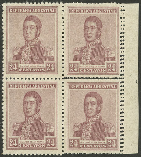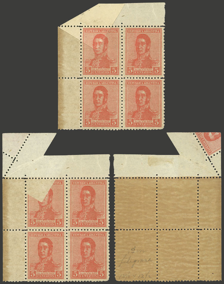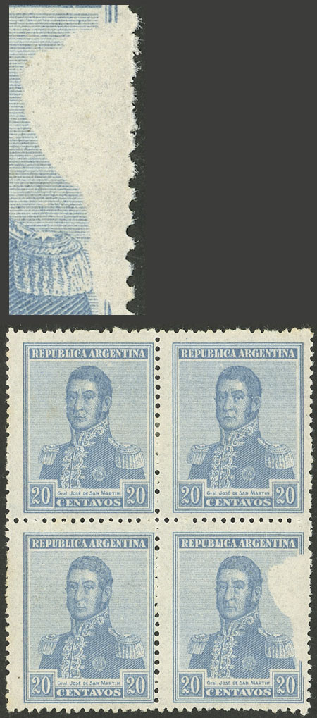 12c. San Martín without watermark, block of 4, one partially UNPRINTED, excellent! (Image)
