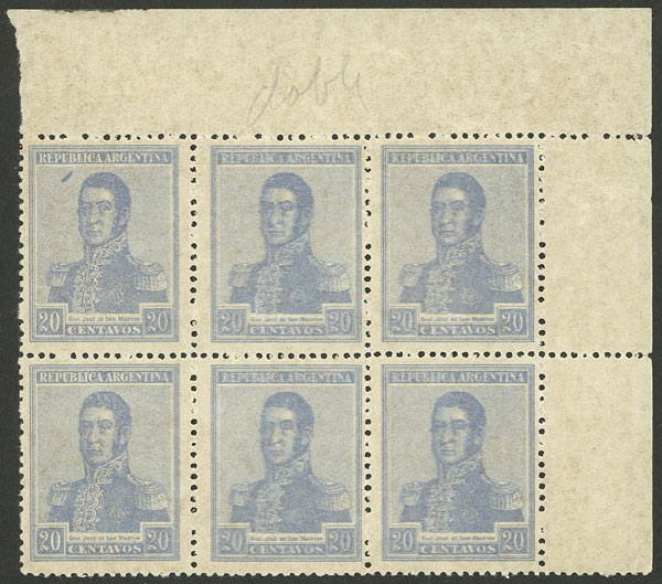 472b, 1917 20c. San Martín, corner block of 6, the 4 right stamps with COMPLETE DOUBLE IMPRESSION and the left ones with partial double impression, MNH (+50%), superb!