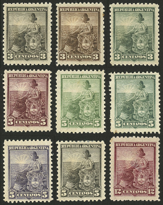 other values, 1899 Seated Liberty, 9 color proofs printed on normal paper of the issue with gum, watermark and perforation, very rare, all different. The 12c. proof with defect, the rest of fine quality! (Image)