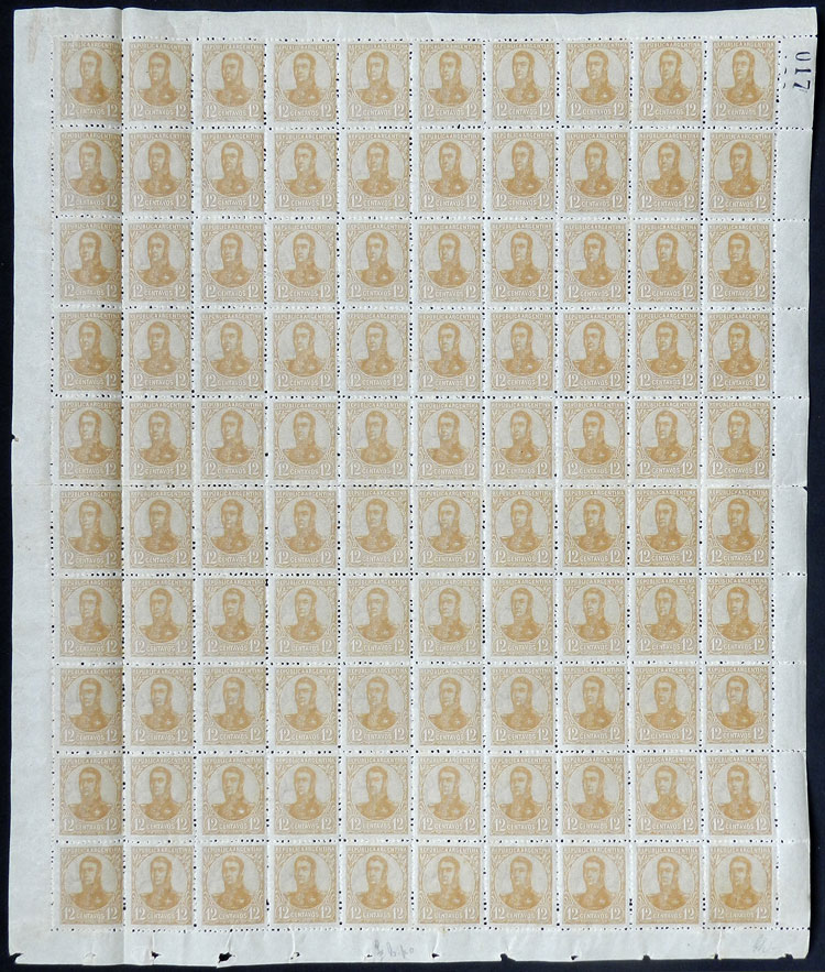 1908 San Martín in oval 12c. orange, complete sheet of 100 stamps, MNH (only 3 or 4 reinforced with hinge), excellent quality, the most beautiful of the 3 or 4 known examples! (Image)