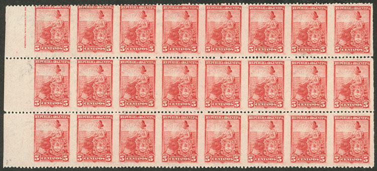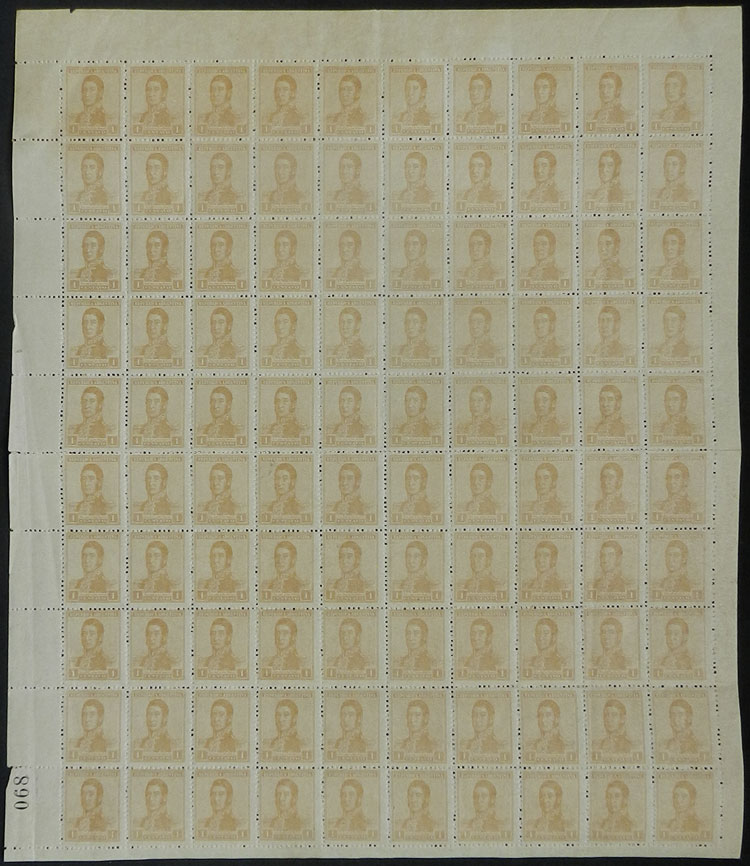 1918 1c. San Martín without watermark, complete sheet of 100 stamps, MNH (a few with hinge marks, insignificant), very fine quality! (Image)