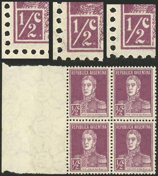 1924 ½c. San Martín WITHOUT period, block of 4 with the period partially uncovered in 3 stmaps, excellent quality, very interesting! (Image)