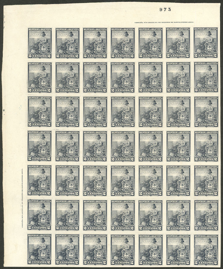 1899 2c. Liberty, PROOF in the issued color, large imperforate block of 49 stamps, top left sheet corner with printer imprint in the margins, printed on card stock with glazed front, excellent and rare! (Image)