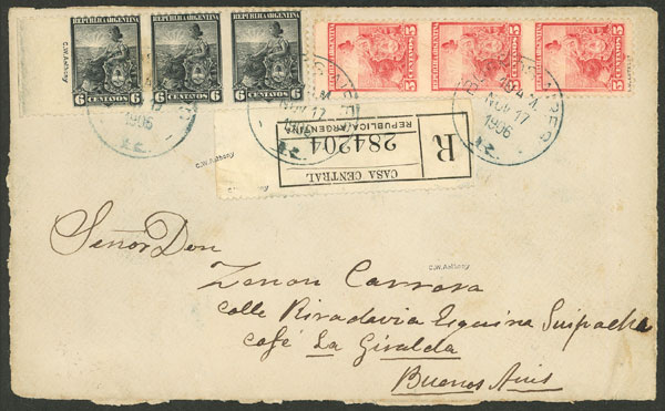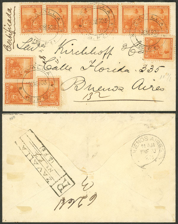 3c. Seated Liberty in strip of 5 + other 5 examples (total 30c.), franking a registered cover sent from ZAVALLA (Santa Fe) to Buenos Aires on 19/JA/1903, fantastic and very rare, possibly the largest multiple of this value on cover! (Image)