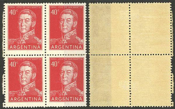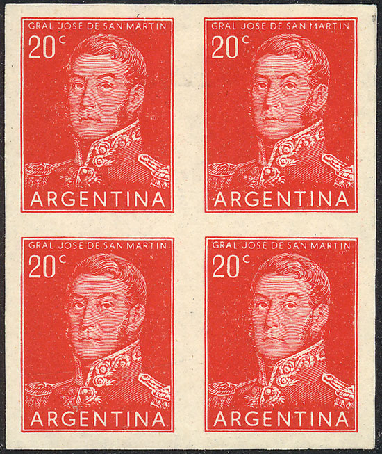 1954/7 20c. San Martín, PROOF in the adopted color, imperforate block of 4 printed on ordinary paper, VF quality, rare! (Image)