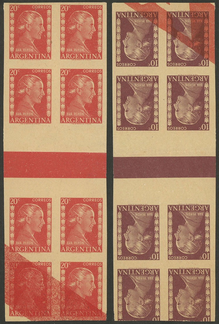 1952 20c. Eva Perón, proof in the issued color printed on paper for specimens, block of 8 stamps with horizontal GUTTER. On back it has another proof of the 10c. value (GJ.1005) with similar characteristics, very fine quality, rare! (Image)