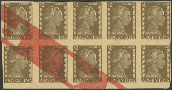 1952 50c. Eva Perón, proof in the issued color printed on special paper for specimens, large block of 10, very fine quality, rare! (Image)