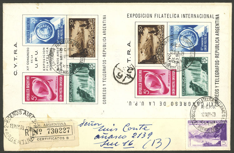 GJ.830, 1939 5P. UPU Congress (high value of the set) + s.sheet GJ.HB 5 franking a cover used in Buenos Aires on 19/MAY/1939, excellent quality, very rare!