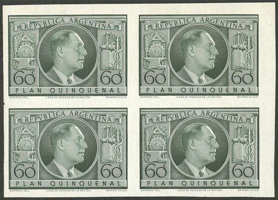 GJ.1000ZA, 1951 President Juan Perón, stamp prepared but not issued, imperforate block of 4 printed on chalky paper with large sun watermark, bluish green, very fine quality, rare! (Image)