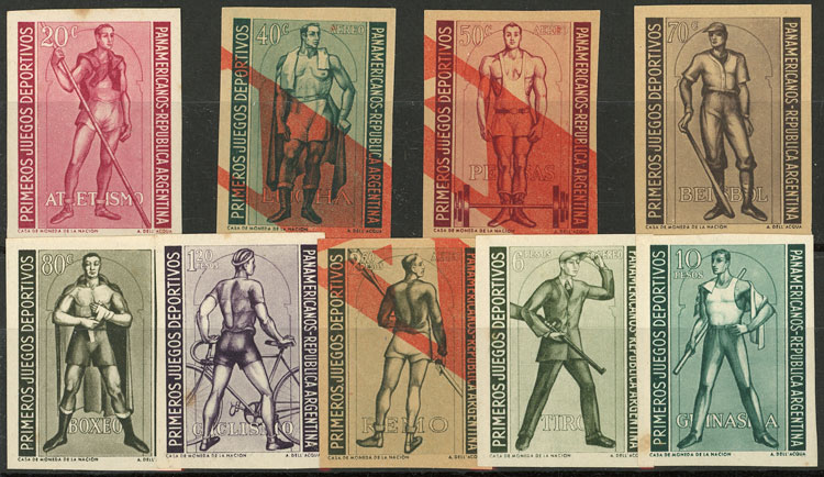 25/FE/1951 First Pan-American Games, unadopted essays printed in photogravure by Casa de Moneda on opaque paper for specimens, extremely rare group of 9 essays with values of 10c. to 10P. and vignettes illustrated with views of different