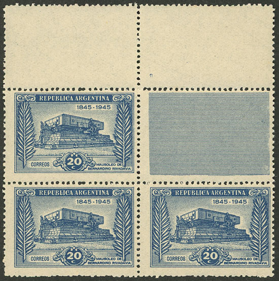 RARITY: GJ.925CAB + 925CAD1945 Mausoleum of Rivadavia, large block of 3 stamps + decorated label + 2 white labels above, fantastic and very rare! (Image)