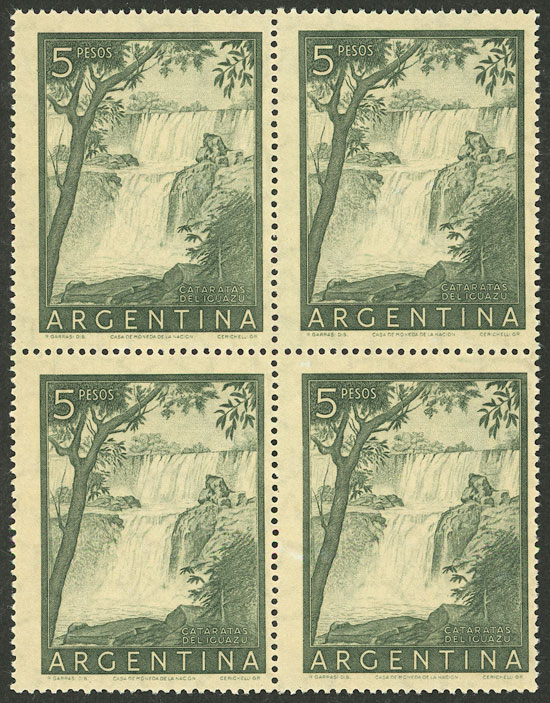 GJ.1053ASG, 5P. Iguazú Falls, block of 4 PRINTED ON GUM, very fine quality, rare! (Image)