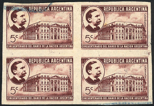 GJ.853, 1941 Banco de la Nación Argentina, PROOF in chestnut, imperforate block of 4 on special paper for specimens, VF quality, very rare (not listed by Kneitschel) (Image) (Image-02)