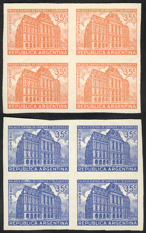 1942/52 Central Post Office 35c., PROOFS in orange and ultramarine (adopted color), imperforate blocks of 4 on paper with glazed front, VF quality! (Image)