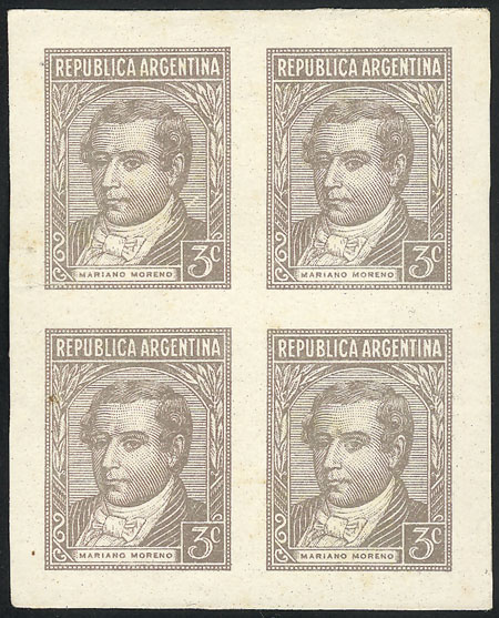 1942/52 3c. Moreno, PROOF in chestnut-gray, imperforate block of 4 on paper with glazed front, VF, rare! (Image)