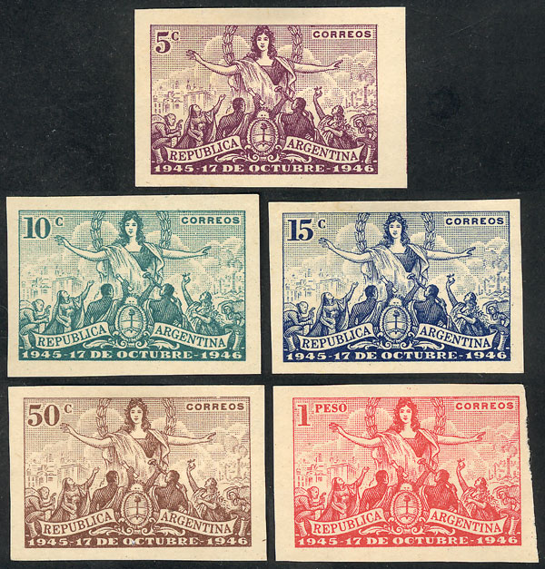 1946 First anniversary of 17 October 1945, PROOFS in the adopted colors, complete set of 5 values on opaque paper, VF quality! (Image)
