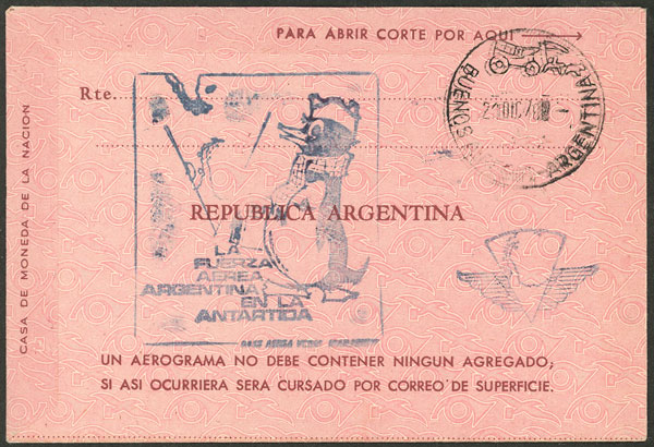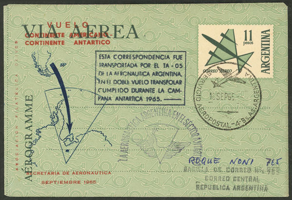 6   image$11 Aerogram with handstamp: "ESTA CORRESPONDENCIA FUE TRANSPORTADA POR EL TA-05 DE LA AERONÁUTICA ARGENTINA, EN EL DOBLE VUELO TRANSPOLAR CUMPLIDO DURANTE LA CAPAÑA ANTÁRTICA 1965", VF quality (Image)