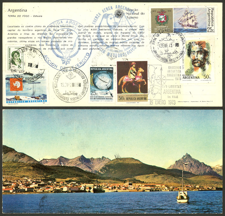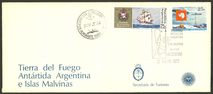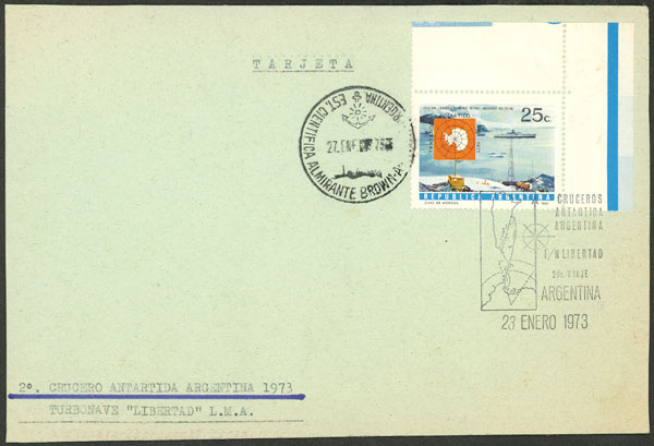 12   imageCard of the 2nd cruise to Argentine Antarctica of the ship "Libertad" in 1973, with marks of Brown station and Port Stanley (Image) (Image-02) (All Images)