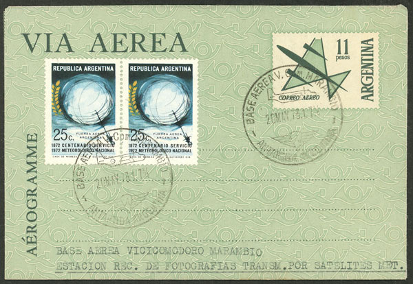 14   image$11 Aerogram uprated with 50c., sent from Marambio Antarctic station to B.Aires on 20/MAY/1973, with handstamps on back of "Servicio Meteorológico", very nice (Image) (Image-02) (All Images)