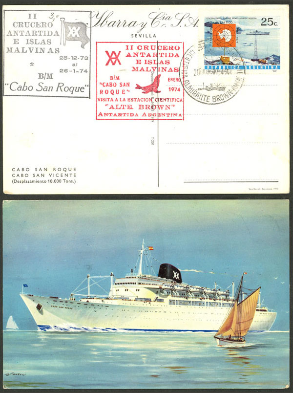 16   imagePostcard with view of ship "Cabo San Roque", with handstamps of the ship and visit to Alte. Brown Antarctic base, with postmark of the base for 26/JUN/1974, very nice (Image)