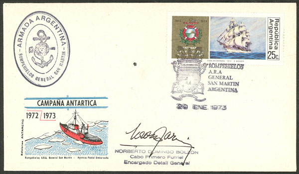 13   imageCover with postmark of icebreaker ARA General San Martín for 29/JA/1973, signed by officer (Image)