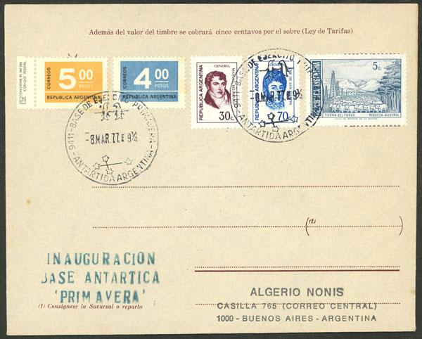 20   imageInauguration of Primavera Antarctic base: Cover sent from the base to B.Aires on 8/MAR/1977 (opening day), blue datestamp, arrival mark on back, rare! (Image) (Image-02) (All Images)